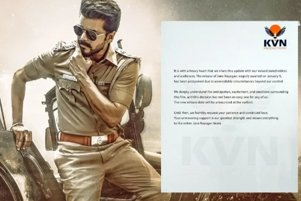 ஜனவரி 9ஆம் திகதி வெளியாகவிருந்த விஜய்யின் 'ஜன நாயகன்' திரைப்படத்தின் வெளியீடு தவிர்க்க முடியாத காரணங்களால் ஒத்திவைக்கப்பட்டுள்ளதாக அதன் தயாரிப்பு நிறுவனமான கே.வி.என் (KVN) புரொடக்ஷன்ஸ் உத்தியோகபூர்வமாக அறிவித்துள்ளது.